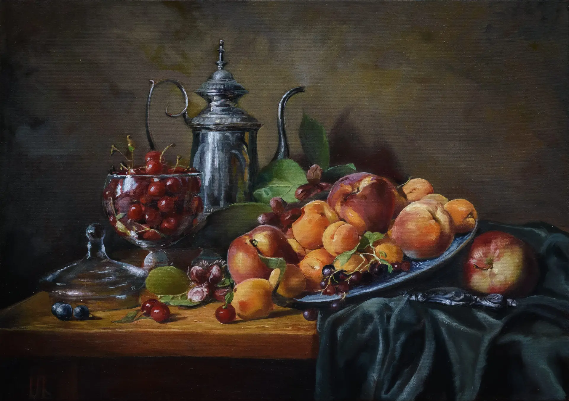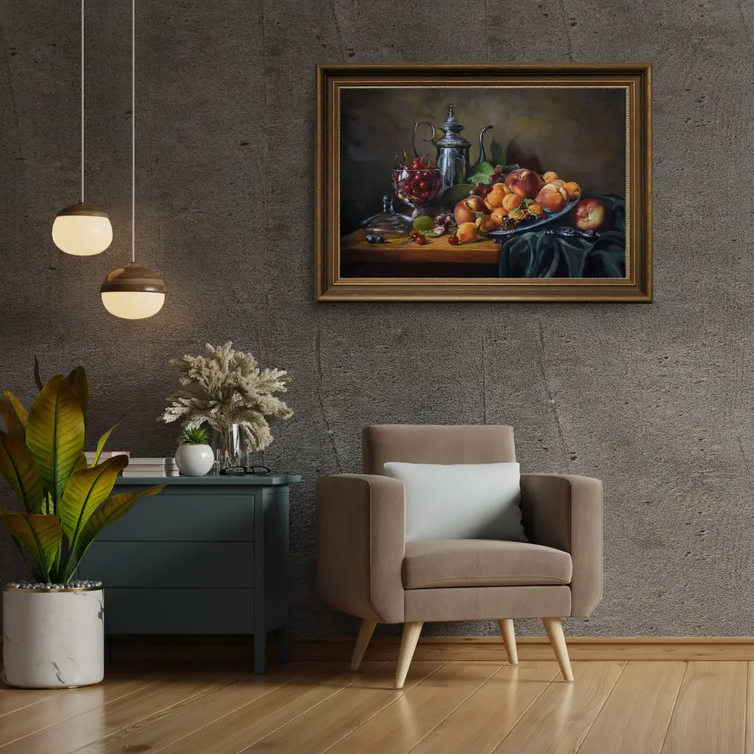 Still life in oils (60 × 42 cm), inspired by chiaroscuro traditions of the Old Masters. Fruits and glass emerge from darkness with dramatic light, offering collectors a refined and intimate Core work.